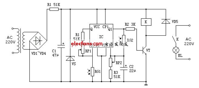 天亮后,RG1 和RG2 阻值下降,IC 的Q1 端又输出低电平,VT 截止,K 释放,EL 熄灭。
