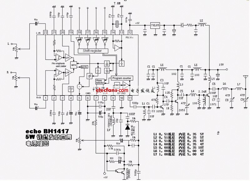 BH1417调频发射电路图如下所示,图中还给出了几个元件的性能参数,包括元件的内径: