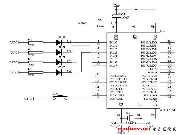 选用MCS-51系列AT89S51单片机作为微控制器,选择两个四联的共阴极数码管组成8位显示模块,由于 AT89S51单片机驱动能力有限,采用两片74HC244 实现总线的驱动,一个74HC244完成位控线的控制和驱动,另一个 74HC244 完成数码管的 7段码输出,在输出口上各串联一个 100欧姆的电阻对7 段数码管限流。