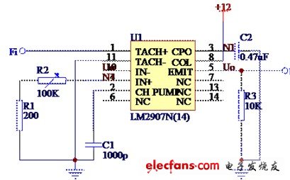 LM2907为集成式频率/电压转换器,芯片中包含了比较器、充电泵、高增益运算放大器,能将频率信号转换为直流电压信号,后接加热、降温电路。