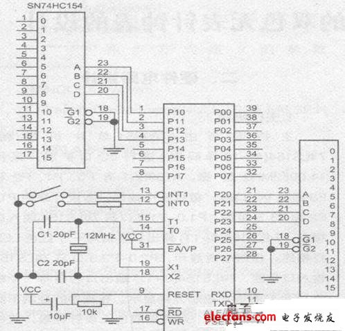 下图是单片机的双色无表针钟表的主控电路原理图。如图可知:以AT89S51 单片机为控制核心,采用 74LS154(4-16 线译码器)扩展I/O 口以控制钟表的显示,并采用12 个红色LED 灯表示小时,12 个绿色LED 灯表示分钟,每隔5 分钟,变化一次。同一时间仅有两个LED 灯亮,节能、方便、易识别,且富有个性。