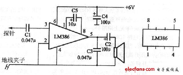 该集成电路信号寻迹器电路简单,仅需一片小功率集成功放电路LM386和5个电容就能组成整机,而且寻迹能力极强。从调谐回路至功放电路,都能方便地检出故障所在,由于声音宏亮,在检查中放及低放电路时,还可以用喇叭放音,无需老挂着耳机,使用很方便。