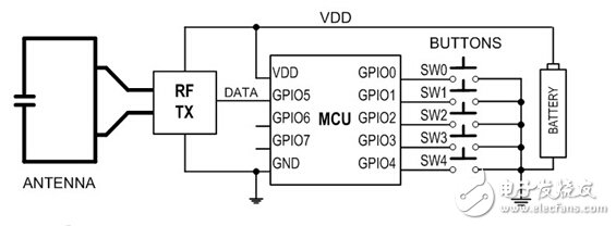 RF遥控器有其共有的特性,如图4结构简图所示。RF遥控器的基本组件包括:为用户提供输入命令的按键;把用户命令转换成数字信息的MCU;用于调制和发射消息的RF发射器;天线;为遥控器提供动力的电池。制造商在设计RF遥控器时所面临的共同挑战,是如何提供稳定的最大传输距离、确保更长的电池寿命和维持较低的系统成本。