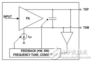 RF60发射器是业界第一款单芯片(RF+MCU)遥控器IC,只需要一个外部旁路电容、一块PCB、电池和一块带按键的外壳,即可构成一个完整的遥控器。图5是RF60功率放大器和天线调谐电路的结构简图。