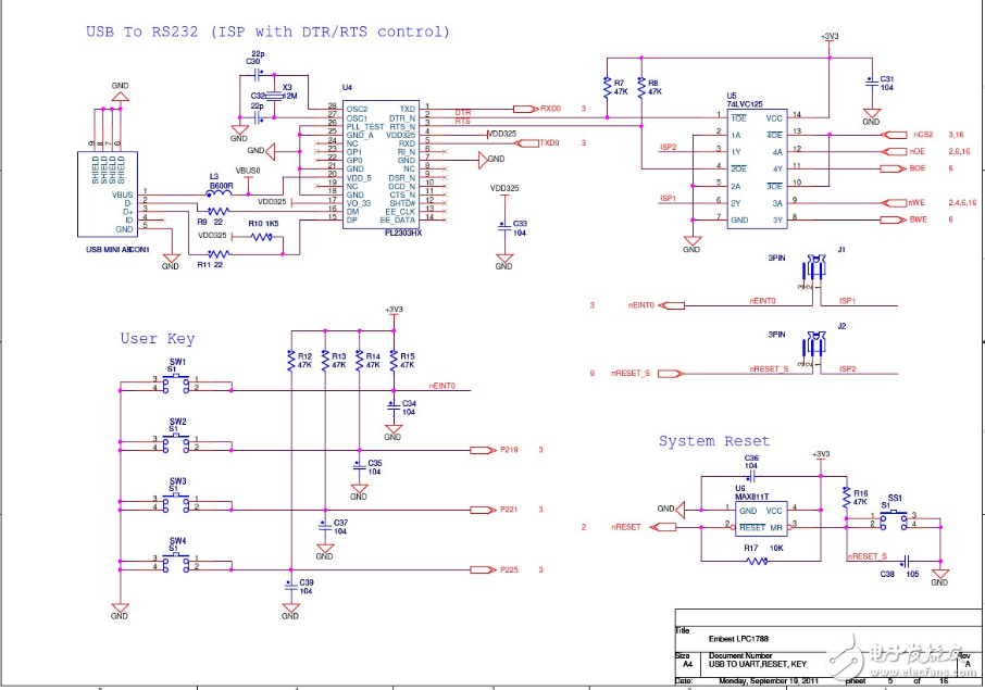 LPC1788是一种适合嵌入式应用的Cortex-M3微控制器,具有较高的整合度和低功耗,运行频率为120 MHz。功能包括512 kB闪存、96 kB数据存储器、以太网、USB 2.0设备/主机/OTG、8通道DMA控制器、5个UART、2个CAN通道、3个SSP/SPI、3个I2C、I2S、8通道12位ADC、10位DAC、QEI、LCD控制器、SD/MMC接口、电机控制PWM、4个通用定时器、6输出通用PWM、带独立电池供电的超低功耗实时时钟以及最多165个通用I/O引脚。