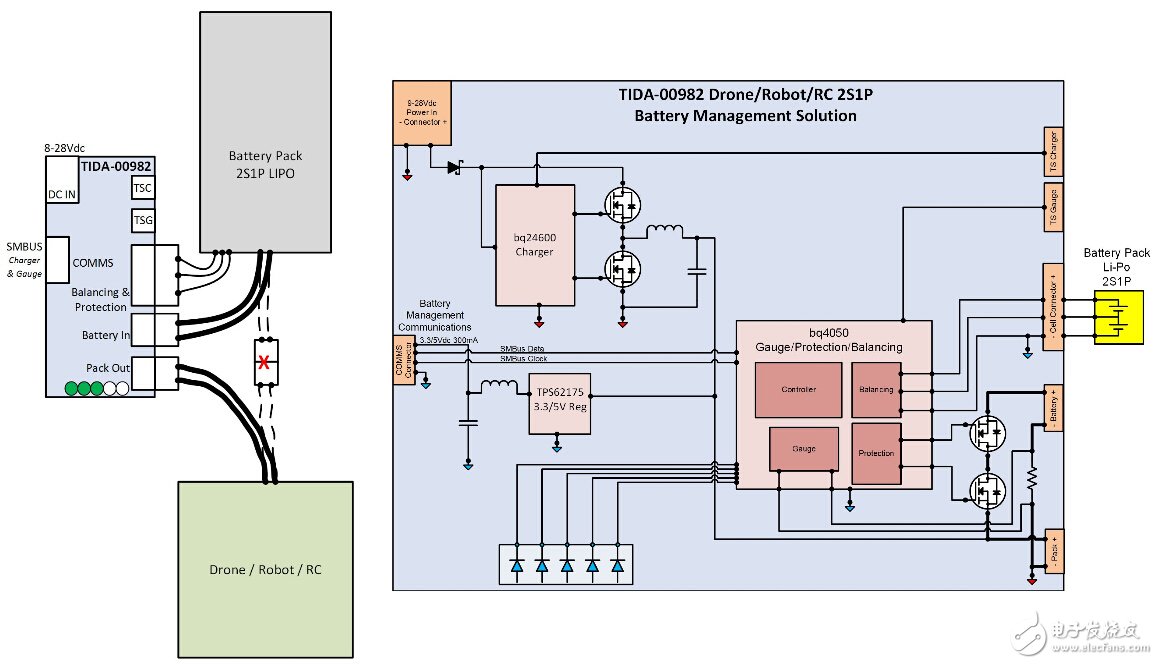 TIDA-00982 参考设计是一款用于 2S1P 电池管理解决方案 (BMS) 的子系统设计,适用于无人机、机器人或无线电控制 (RC) 的项目和设计。可快速将监测、保护、平衡和充电功能添加至适用于无人机、机器人或 RC 产品的任何新设计,或使用此板将高级功能添加至现有设计。此TI参考设计将让您快速且轻松地投入工作并测试高级电池管理功能。