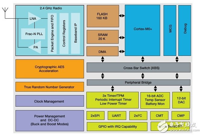 KW40Z MCU集成了一个2.4 GHz收发器,支持多种FSK/GFSK和O-QPSK调制,一个ARM® Cortex®-M0+ 处理器,160 KB闪存和20 KB SRAM,BLE链路层硬件,802.15.4分组处理器,硬件安全和外围设备,优化后满足目标应用的要求。KW40Z拥有足够的片上内存,可为多模应用同时运行Bluetooth Low Energy协议栈和IEEE 8021.5.4 MAC/PHY。