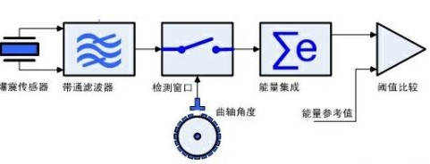 爆震发生在做功冲程刚开始的时间里(压缩冲程活塞运动到最高点(TDC)稍后的时间里)。我们不仅知道爆震共鸣声的大致频率(约为7K及其谐波),还知道爆震发生的大致曲轴角度范围。图1是根据该原理的一个标准的爆震检测框图。常用的爆震传感器内部封装一个压电陶瓷,将监听到的发动机运行声音转换为电信号。来自爆震传感器的电信号通过一个带通滤波器。带通滤波器将所需要的频率信号提取出来。根据曲轴角度信号产生一个角度窗口,这个窗口覆盖了爆震可能发生的时段。这样,从检测窗口输出的信号就是在时域和频域都做了选择的,我们感兴趣的爆震信号。为了判断爆震的强度,最直接的方法就是将信号绝对值加起来,即能量集成。将能量集成后的数据与预先设定的爆震能量参考值进行比较,就可以判断出爆震是否发生。