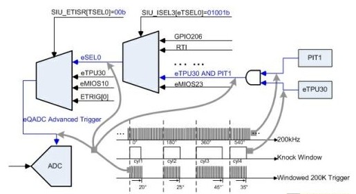 爆震只在特定角度窗内(TDC稍后的一段时间)才可能发生,故只需让ADC在恰当的窗口内工作。这个窗口由eTPU产生。eTPU是一个独立于内核以外的 RISC引擎,在Monaco中eTPU与32个定时通道紧密组合在一起,专注于复杂、高实时性的定时逻辑。其最重要的功能是根据输入的曲轴和凸轮轴的脉冲信号来产生发动机工作的角度基准。这样使EMS的控制算法可基于角度空间,eTPU还同时提供基于角度的喷油和点火控制功能。飞思卡尔提供了完备的 eTPU微码和全面的库函数以便用户使用。其中包括爆震窗口的产生:在不同的发动机转速下对于不同的汽缸都能实时给出所期望的基于角度的窗口。