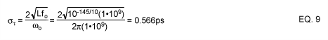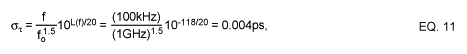 By definition, A/(ΔA) is the signal-to-noise ratio, and Δt is the root-mean-square (RMS) value of the jitter. EQ. 3 can be rewritten as: