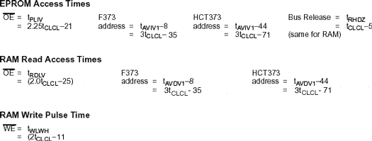 For the user who wishes to calculate the memory speed requirements using a crystal frequency not shown in the preceding tables, the following equations provide a concise summary of the information needed. These times are for zero stretch cycles. The memory devices selected must have an address access time (based on the use of an F373 or an HCT373), an active-low OE access time, a active-low WE time, and a bus release time less than or equal to the calculated values. Note again that tCLCL is the period of the clock.