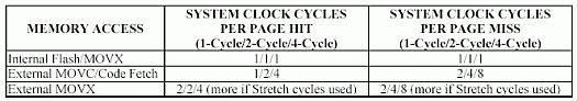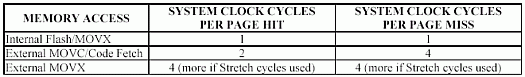 Because program memory and data memory accesses have similar timings (when no stretch cycles are selected), Table 5 provides a convenient summary of required MOVX memory access timings for various system clock frequencies for page mode (1-cycle), and non-page mode for common microcontroller frequencies. This is a good starting point for selecting a data memory device.