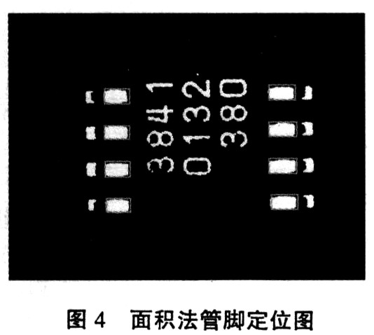 面积法是通过编写程序在整幅图像中搜索白色区域,同时记下白色区域的面积(像素点个数)和个数及其四个边角的坐标。将所统计到的面积相加,除以白色区域的个数,即可得到一个阈值,由于集成块管脚所占的面积要比其他无用信息所占的面积要大的多,所以面积平均所得到的阈值可以将较小的区域去除,从而保留有用的集成块的管脚信息。将大于这一阈值的面积区域用其四个边角的坐标连线所成的矩形框定,便可以完成集成块的管脚定位。