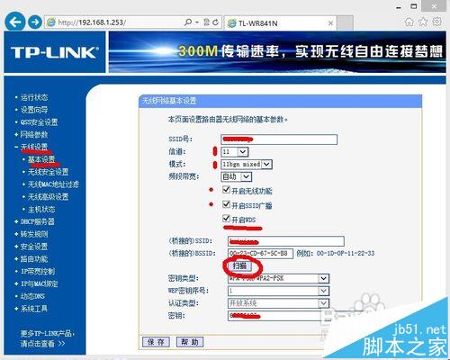 5、进入到无限设置中,路由器1所有的设置 一定 要保证和路由器2的设置一摸一样,最后勾选开启WDS,输入要桥接的无限路由器的SSID和BSSID(mac地址)。
