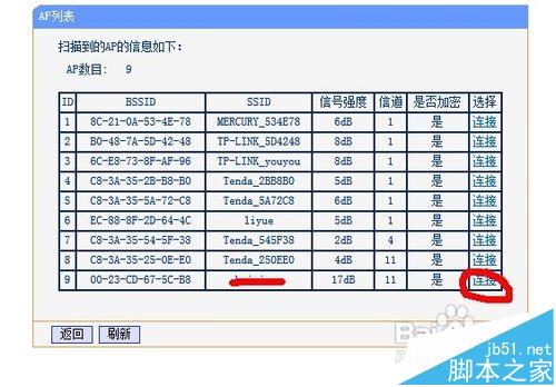 6、如果不知道,就点击搜索,扫描附近信号,选择刚刚配置好的路由器2的名字,点击连接, SSID和BSSID就会自动导入了。