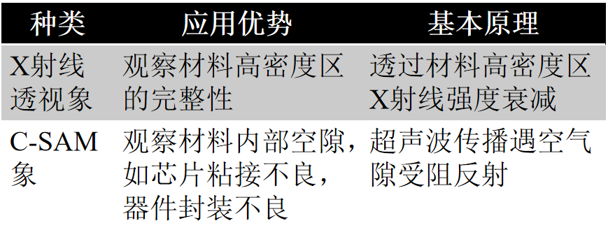除电测技术分析外,有X-射线和反射式声学扫描显微技术等。