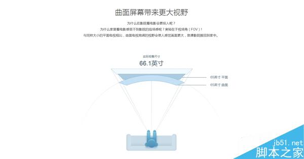 小米称,65寸曲面电视带来的感受相当于66.1寸平面电视,因为曲面电视带来的视场角(FOV)更大。